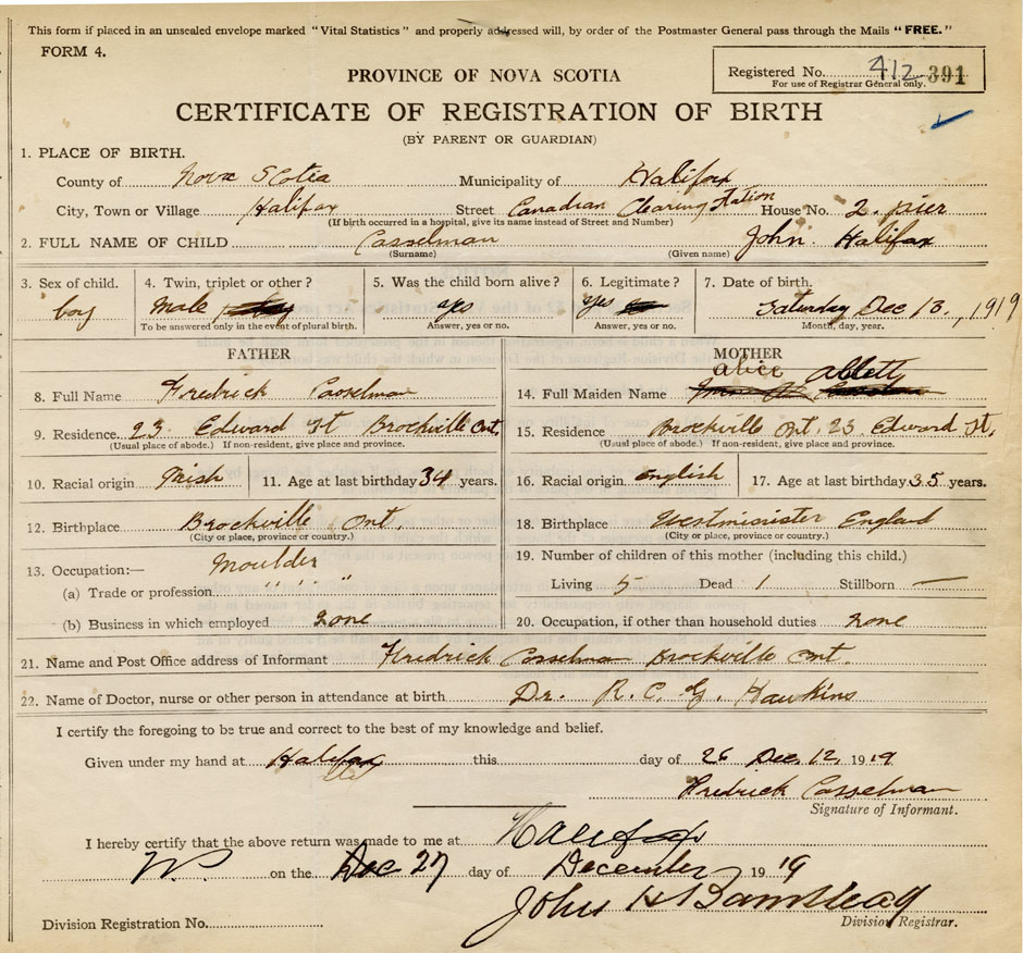 I hereby make application for the Registration of Birth of John HalifaxCasselman Sex Male