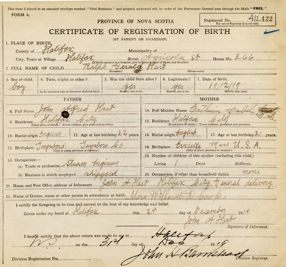 I hereby make application for the Registration of Birth of Ralph GeraldHart Sex Male
