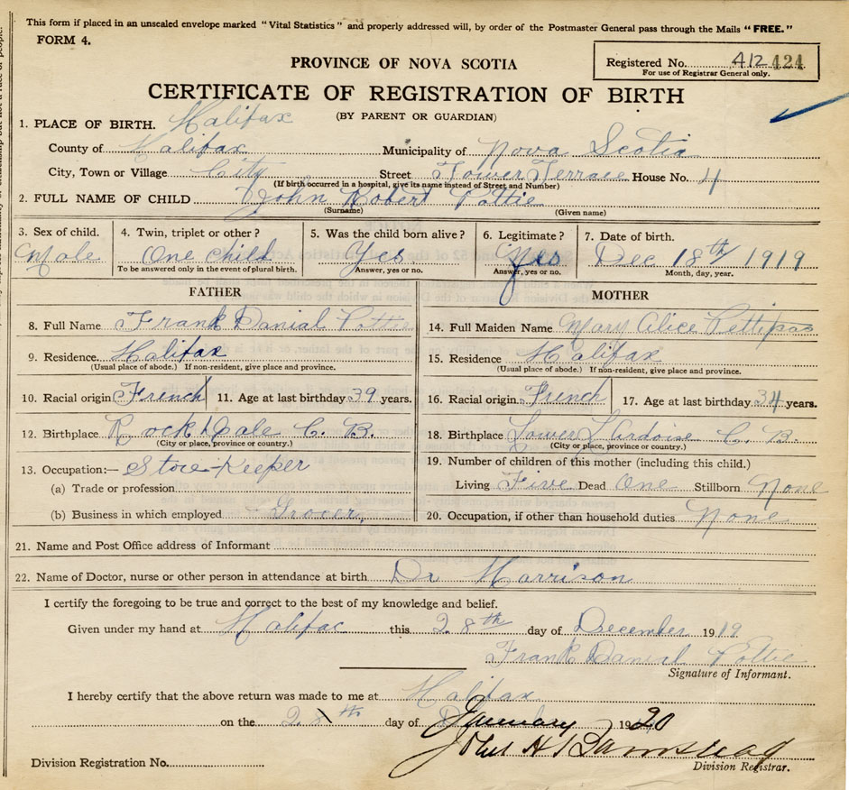 Name of Father Frank Daniel Pottie MAIDEN NAME of Mother Mary Alice Pettipas