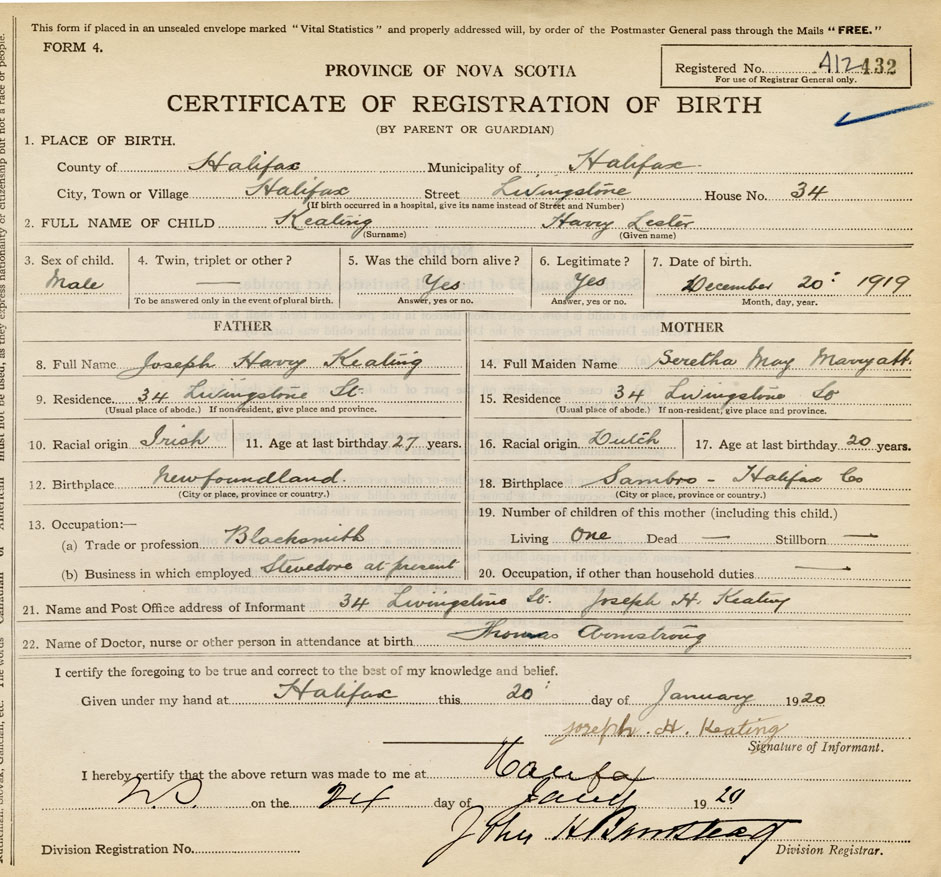 Residence of Father when child was born Halifax Present address of Father 34 Livingstone St.