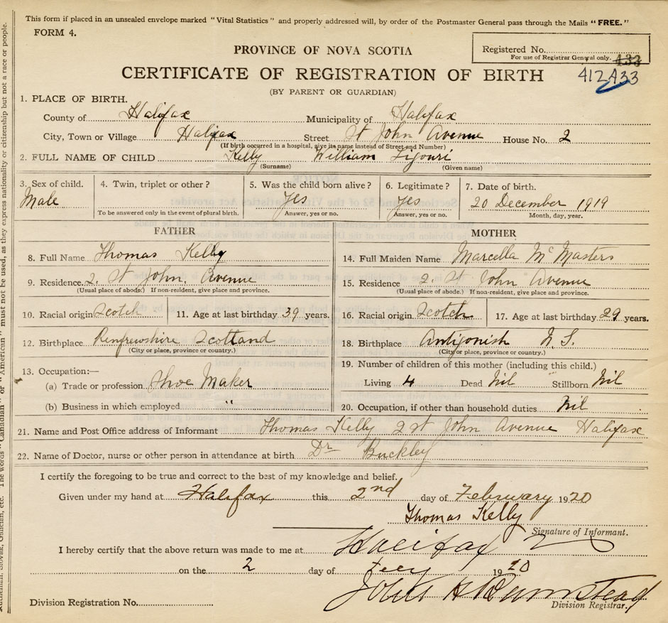 Residence of Father when child was born Halifax Present address of Father 2 St. John Ave.