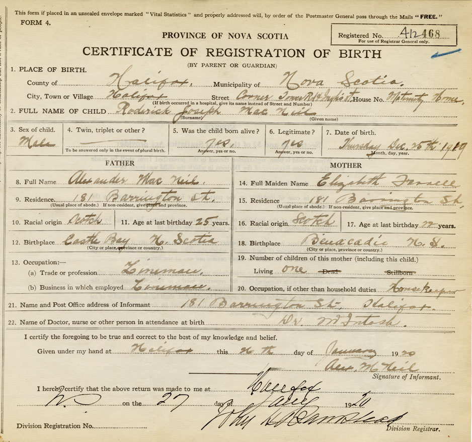 I hereby make application for the Registration of Birth of Roderick JosephMacNeil Sex Male