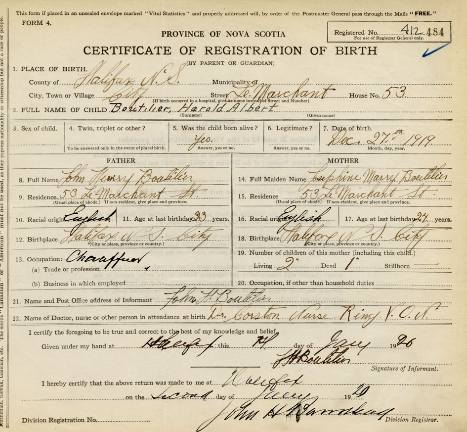 I hereby make application for the Registration of Birth of Harold AlbertBoutilier Sex Male