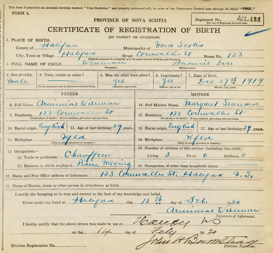 Residence of Father when child was born Halifax Present address of Father 123 Cornwallis St.