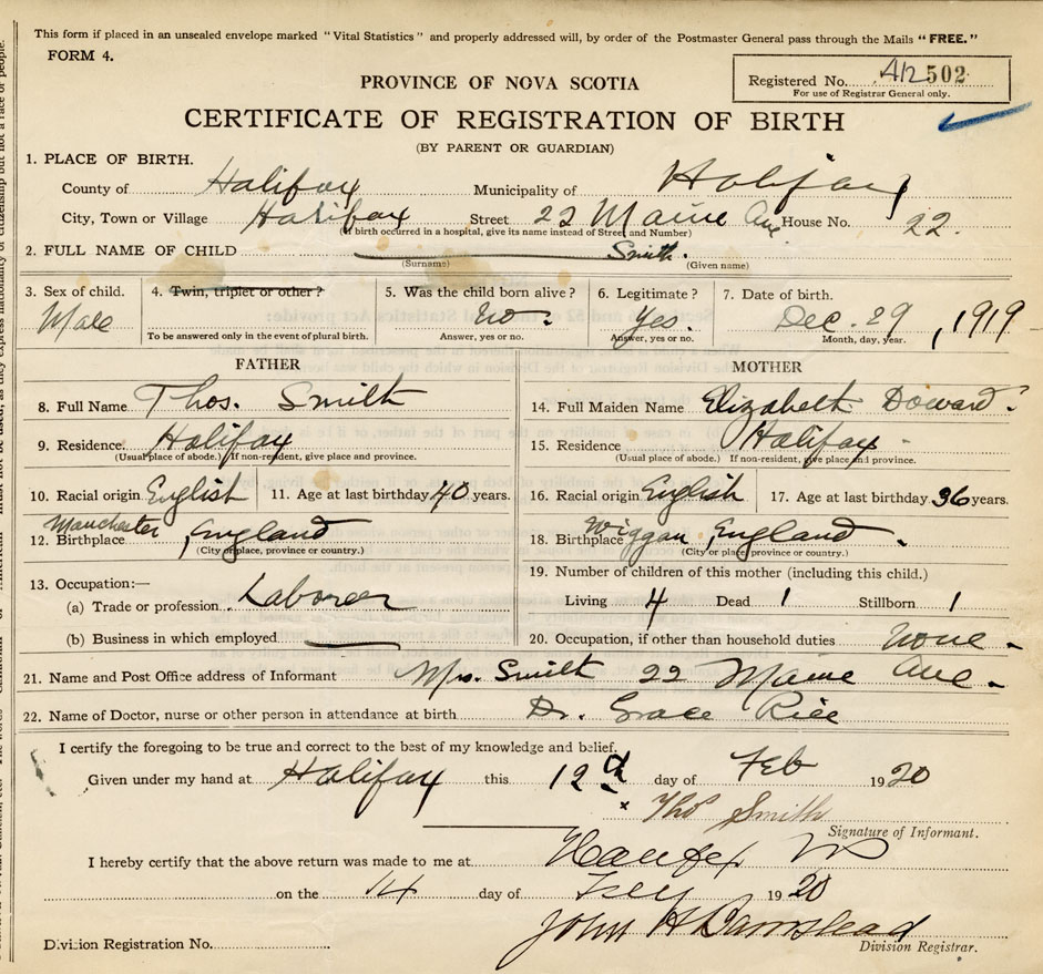 Residence of Father when child was born Halifax Present address of Father 22 Maine Ave.