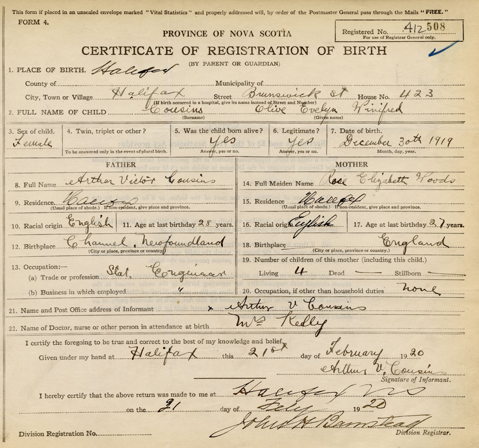 I hereby make application for the Registration of Birth of Olive Evelyn WinifredCousins Sex Female