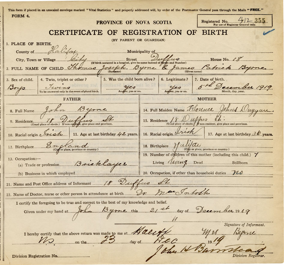 21. Name and Post Office address of Informant 18 Duffus St. Halifax