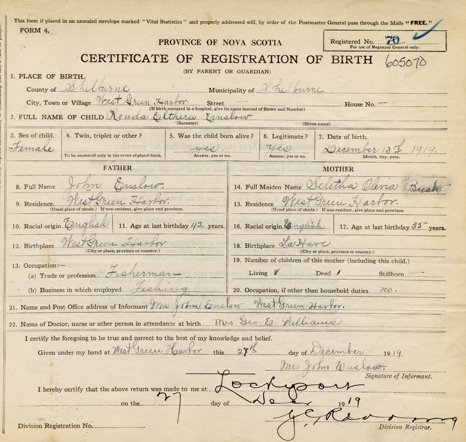 21. Name and Post Office address of Informant Mrs. John Enslow West Green Harbour