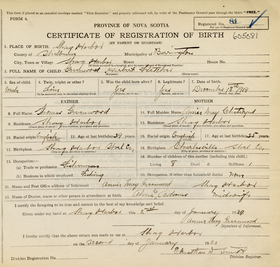 21. Name and Post Office address of Informant Annie May Greenwood Shag Harbour