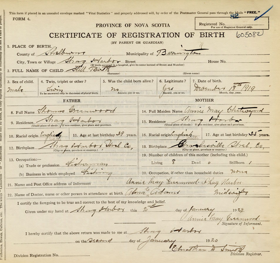 21. Name and Post Office address of Informant Annie May Greenwood Shag Harbour