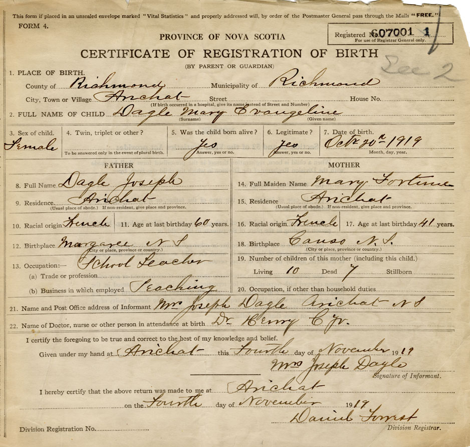21. Name and Post Office address of Informant Mrs. Joseph Dagle Arichat