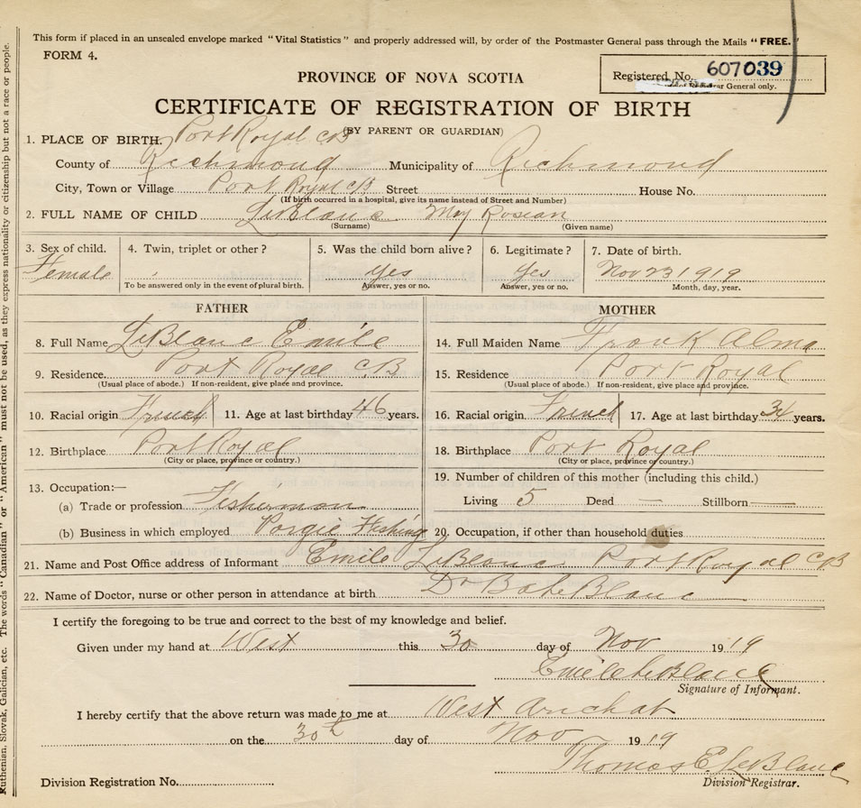 22. Name of Doctor, nurse or other person in attendance at birth Dr. B.A. LeBlanc