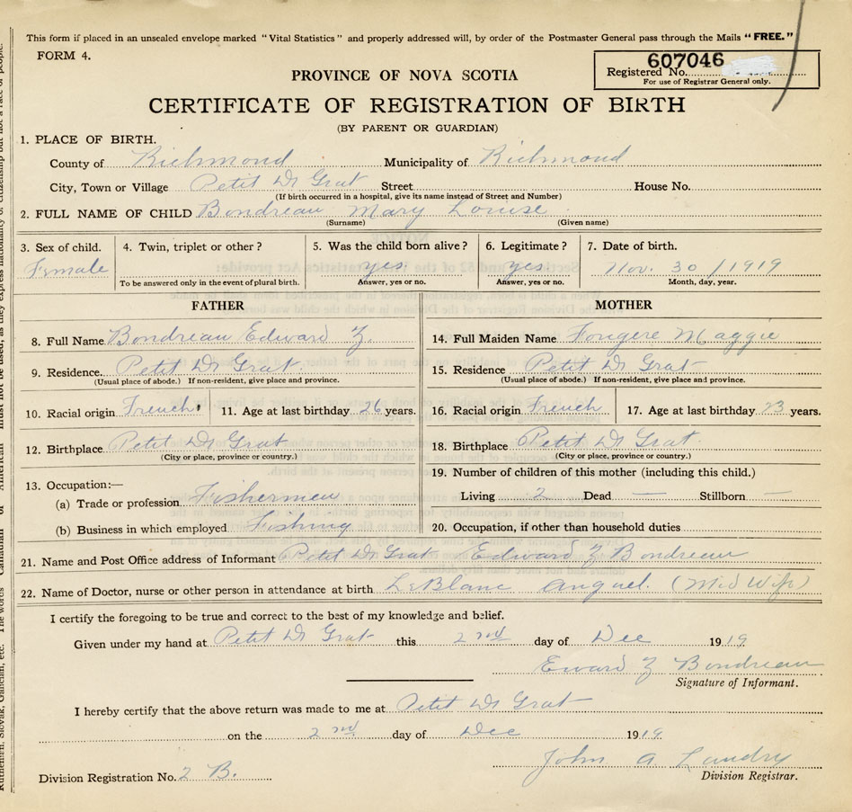 22. Name of Doctor, nurse or other person in attendance at birth Auguel LeBlanc (midwife)