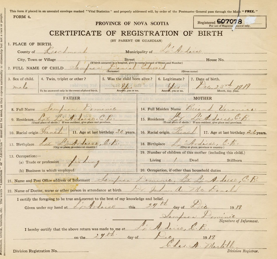 21. Name and Post Office address of Informant Dominic Sampson Lower L'Ardoise, Richmond Co., NS