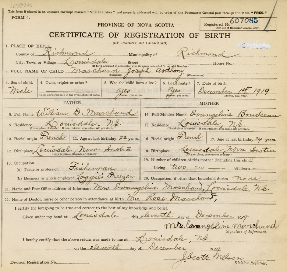 21. Name and Post Office address of Informant Mrs. Evangeline Marchand Louisdale, Richmond Co., NS