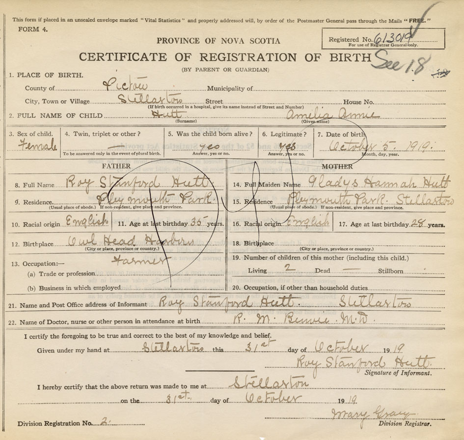 21. Name and Post Office address of Informant Roy Stanford Hutt Stellarton, Pictou Co., NS