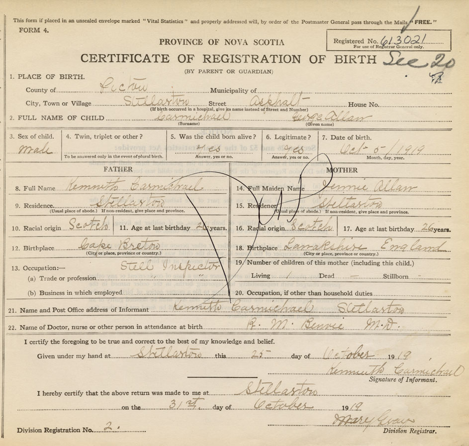 21. Name and Post Office address of Informant Kenneth Carmichael Stellarton, Pictou Co., NS