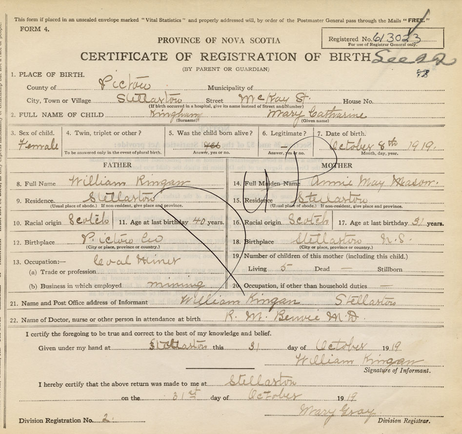 18. Birthplace Stellarton, Pictou Co., NS
