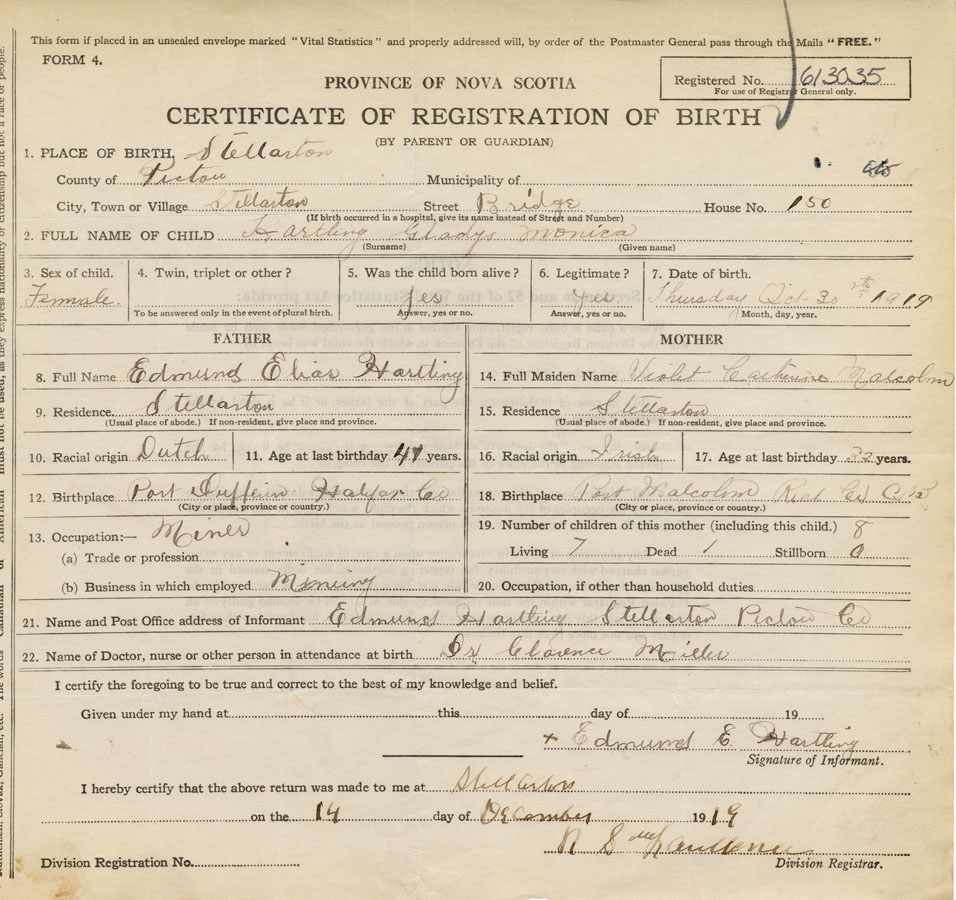 21. Name and Post Office address of Informant Edmund Hartling Stellarton, Pictou Co., NS