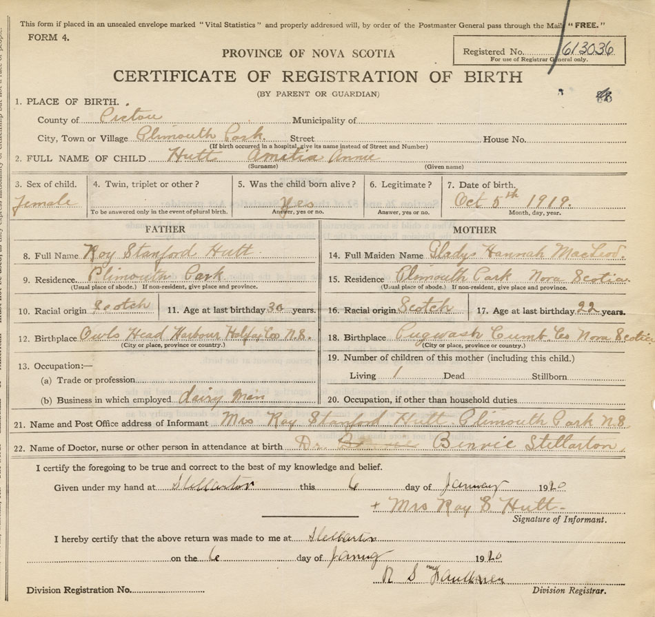 21. Name and Post Office address of Informant Mrs. Roy Stanford Hutt Plymouth Park, Pictou Co., NS