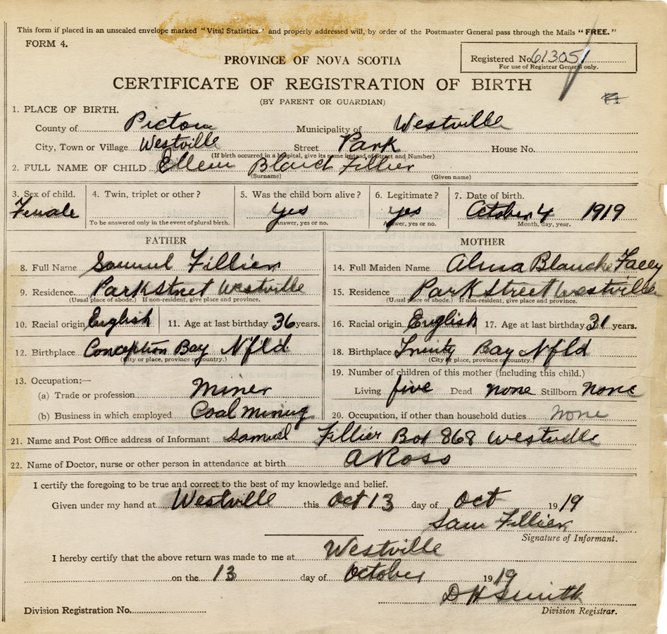 21. Name and Post Office address of Informant Samuel Fillier Box 868, Westville, Pictou Co., NS