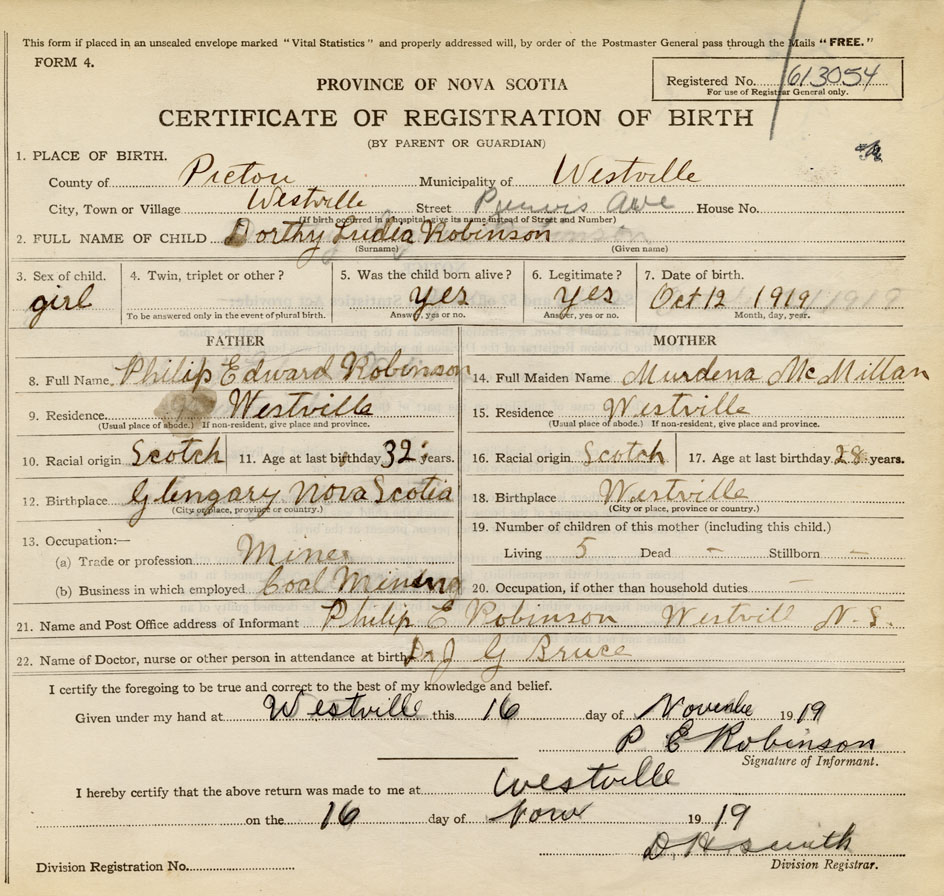 21. Name and Post Office address of Informant Philip E. Robinson Westville, Pictou Co., NS