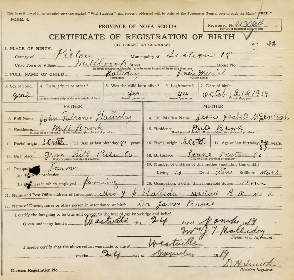 21. Name and Post Office address of Informant Mrs. J. F. Halliday Millbrook, Pictou Co., NS