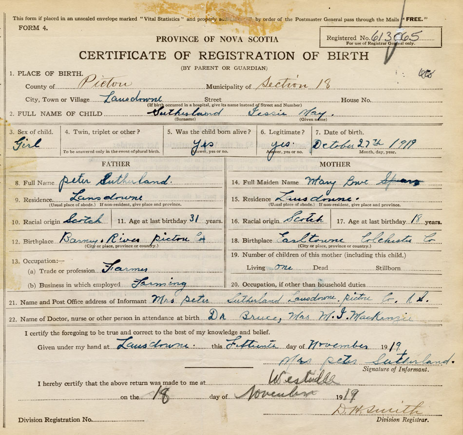21. Name and Post Office address of Informant Mrs. Peter Sutherland Lansdowne, Pictou Co., NS