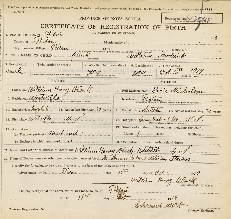 21. Name and Post Office address of Informant William Henry Clark Westville, Pictou Co., NS