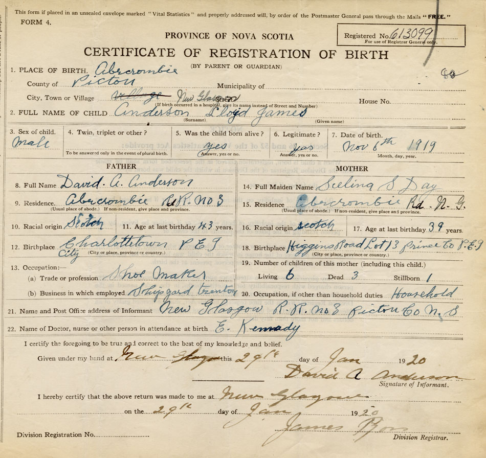 21. Name and Post Office address of Informant David A. Anderson New Glasgow, R.R. 33, Pictou Co., N.S.