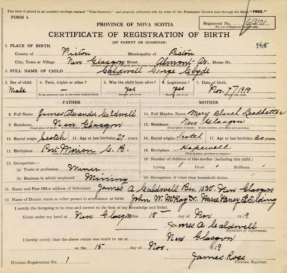 21. Name and Post Office address of Informant James A. Caldwell Box 1035, Thorburn, Pictou Co., NS