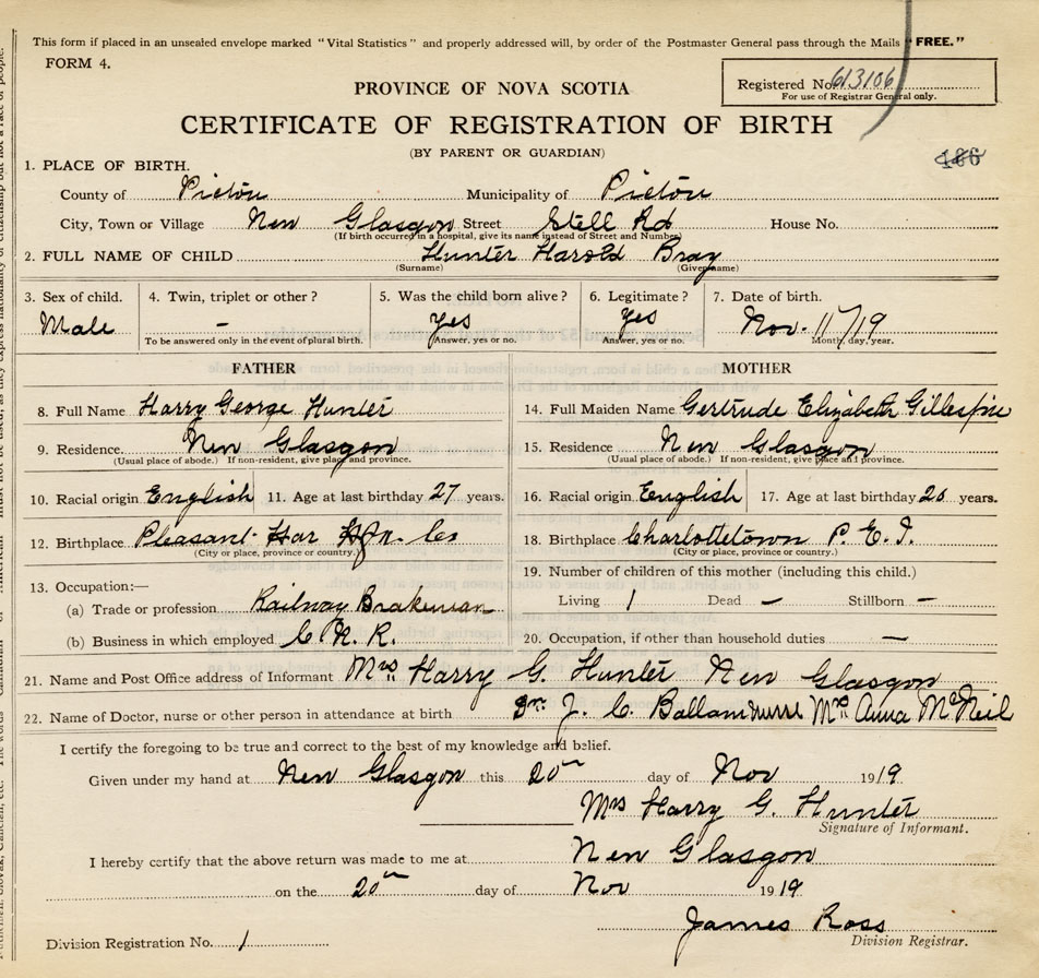 21. Name and Post Office address of Informant Mrs. Harry G. Hunter New Glasgow, Pictou Co., NS