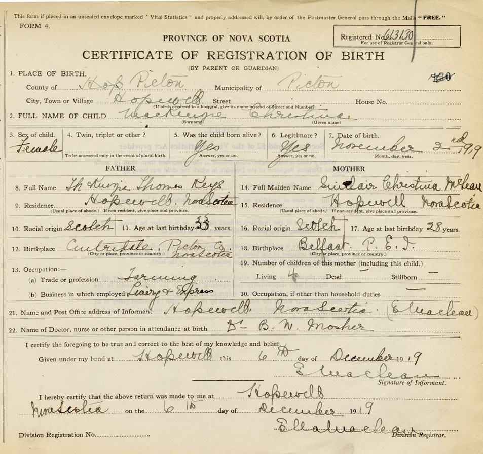 21. Name and Post Office address of Informant E. MacLean Hopewell, Pictou Co., NS