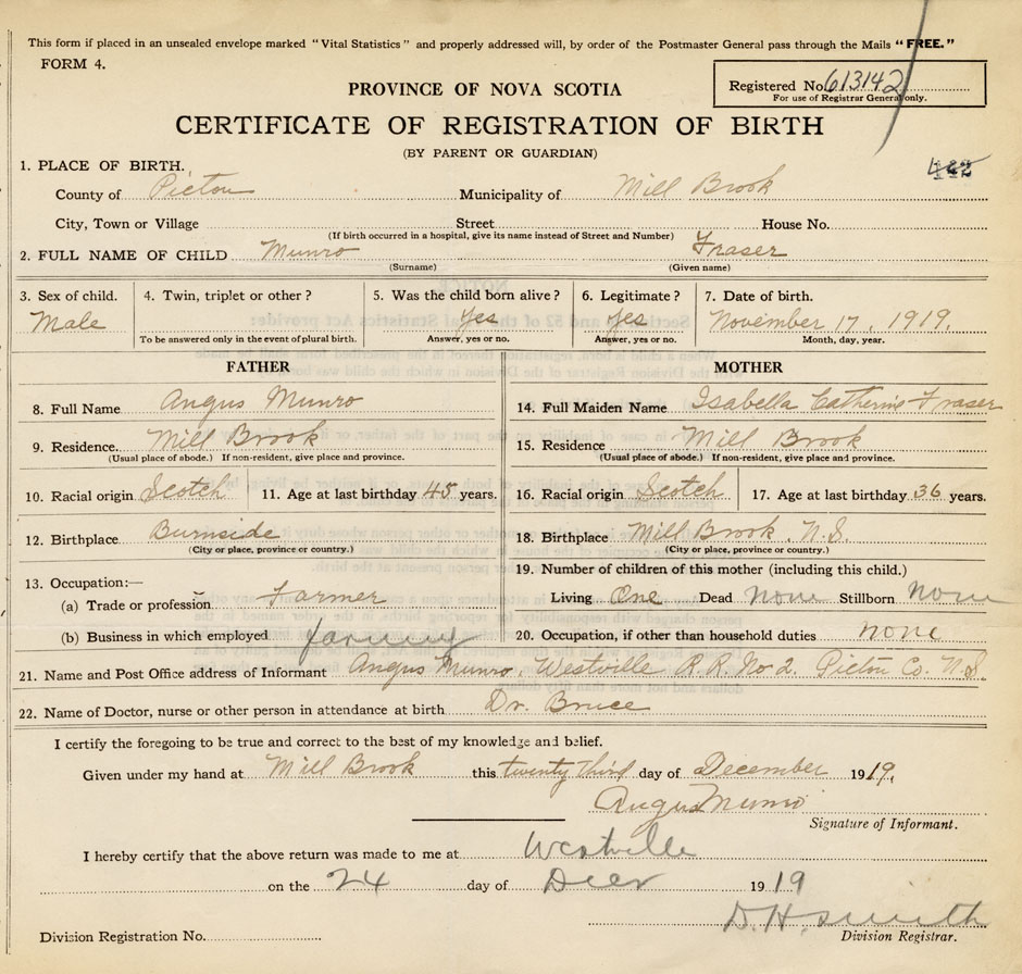 21. Name and Post Office address of Informant Angus Munro RR #2, Pictou Co., NS