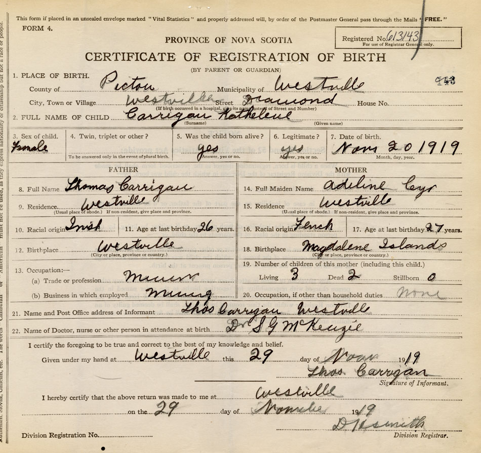 21. Name and Post Office address of Informant Thomas Carrigan Westville, Pictou Co., NS