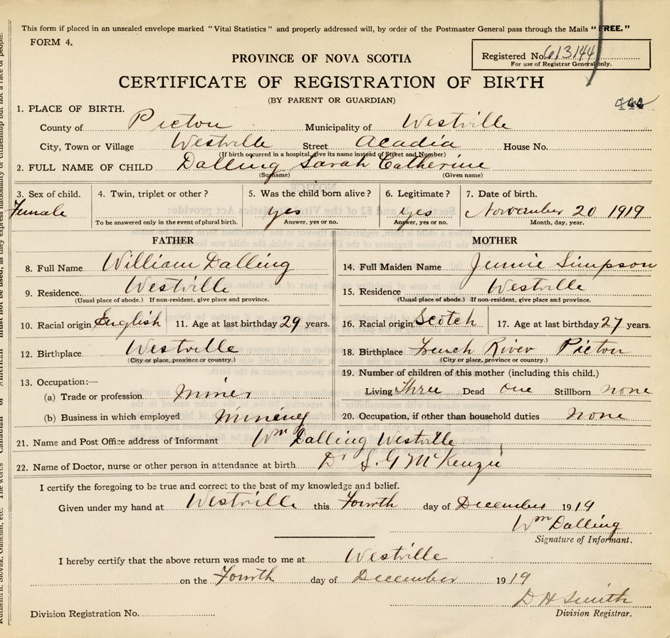 21. Name and Post Office address of Informant William Dalling Westville, Pictou Co., NS