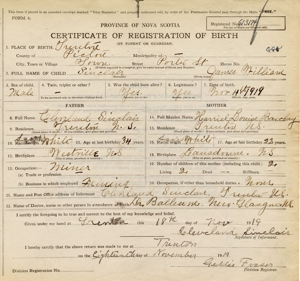 21. Name and Post Office address of Informant Cleveland Sinclair Trenton, Pictou Co, NS