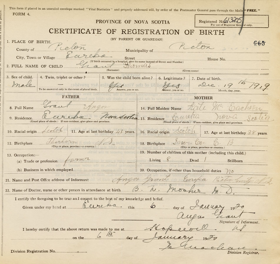 21. Name and Post Office address of Informant Angus Grant Eureka, Pictou County, N.S.