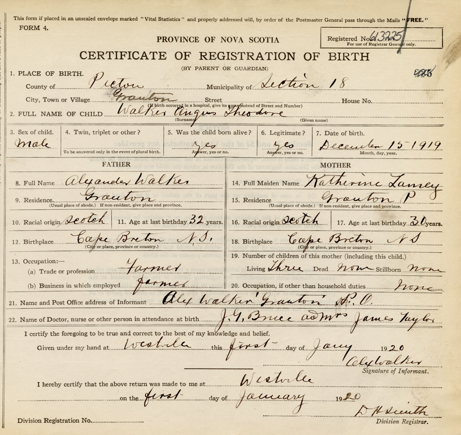 21. Name and Post Office address of Informant Alexander Walker Granton, Pictou Co., NS