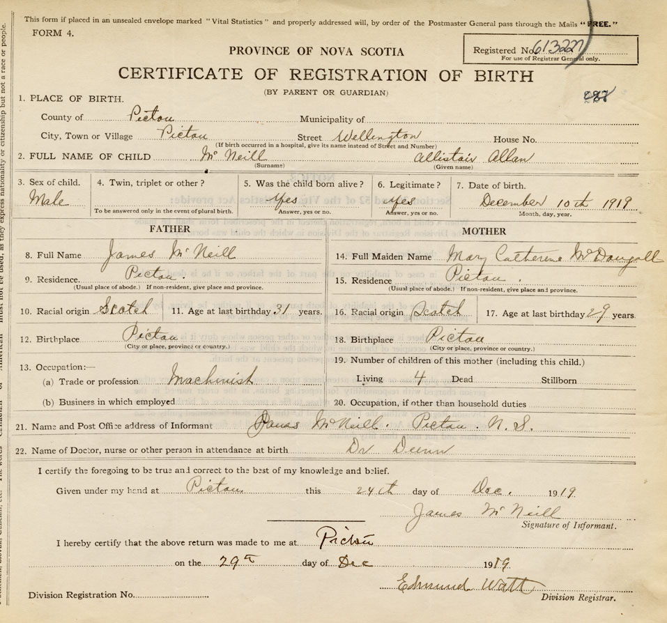 21. Name and Post Office address of Informant James McNeill Pictou, NS