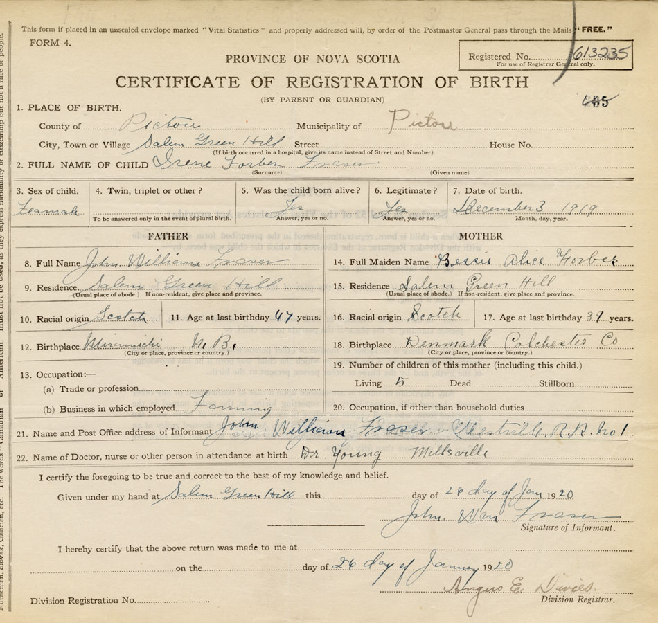 21. Name and Post Office address of Informant John William Fraser RR #1, Westville, Pictou Co., NS