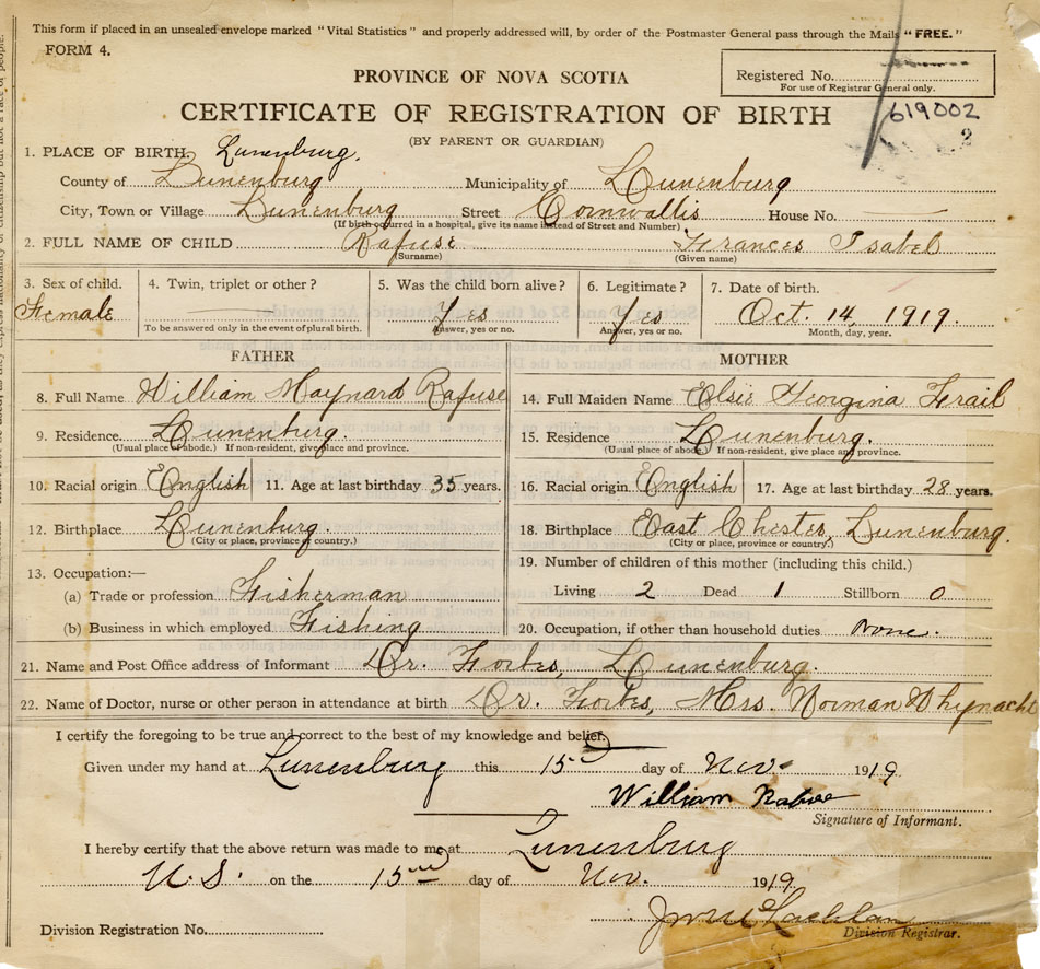 2. FULL NAME OF CHILD Rafuse, Frances Isabel