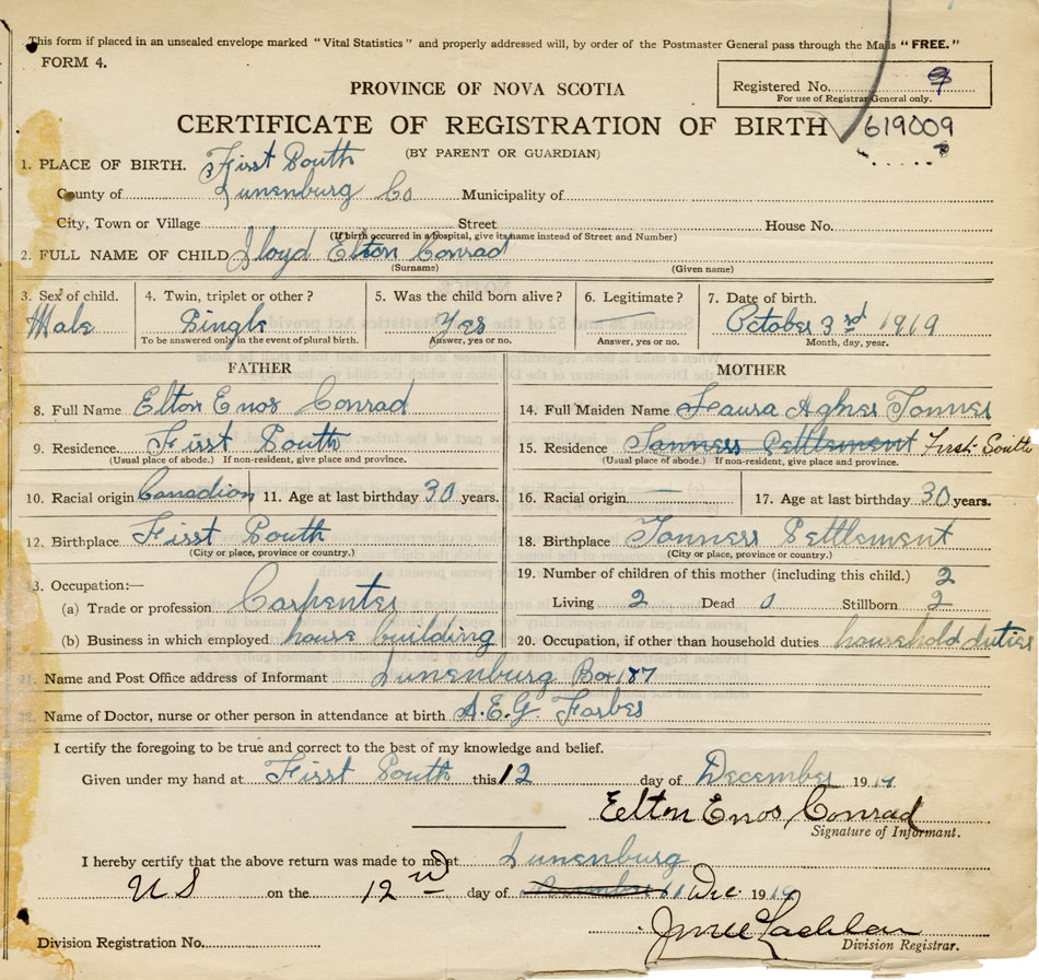 21. Name and Post Office address of Informant Elton Enos Conrad Lunenburg Box 187