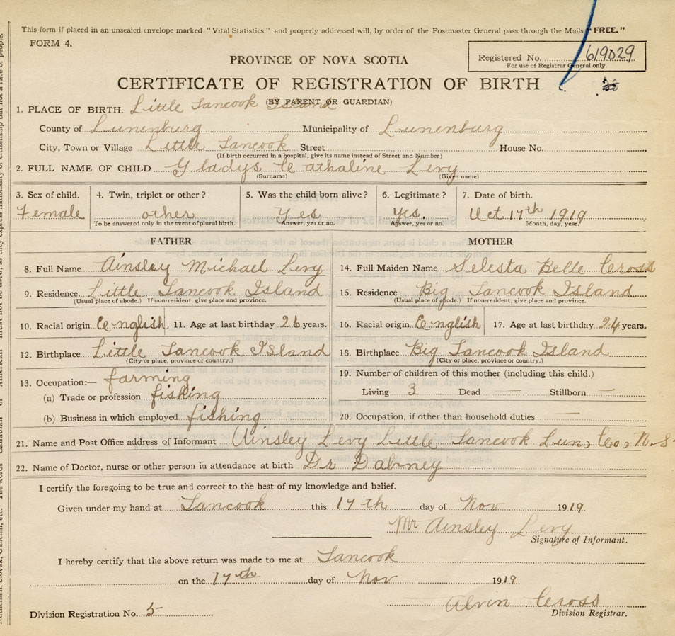 21. Name and Post Office address of Informant Ainsley Levy Little Tancook Island