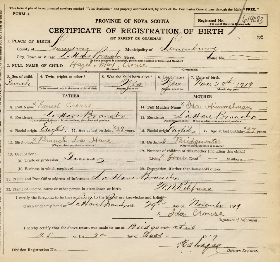 21. Name and Post Office address of Informant Ida Crouse Branch LaHave