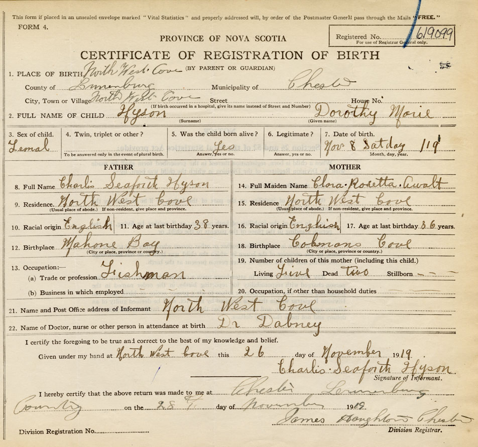 18. Birthplace Colemans Cove, Lunenburg Co., NS