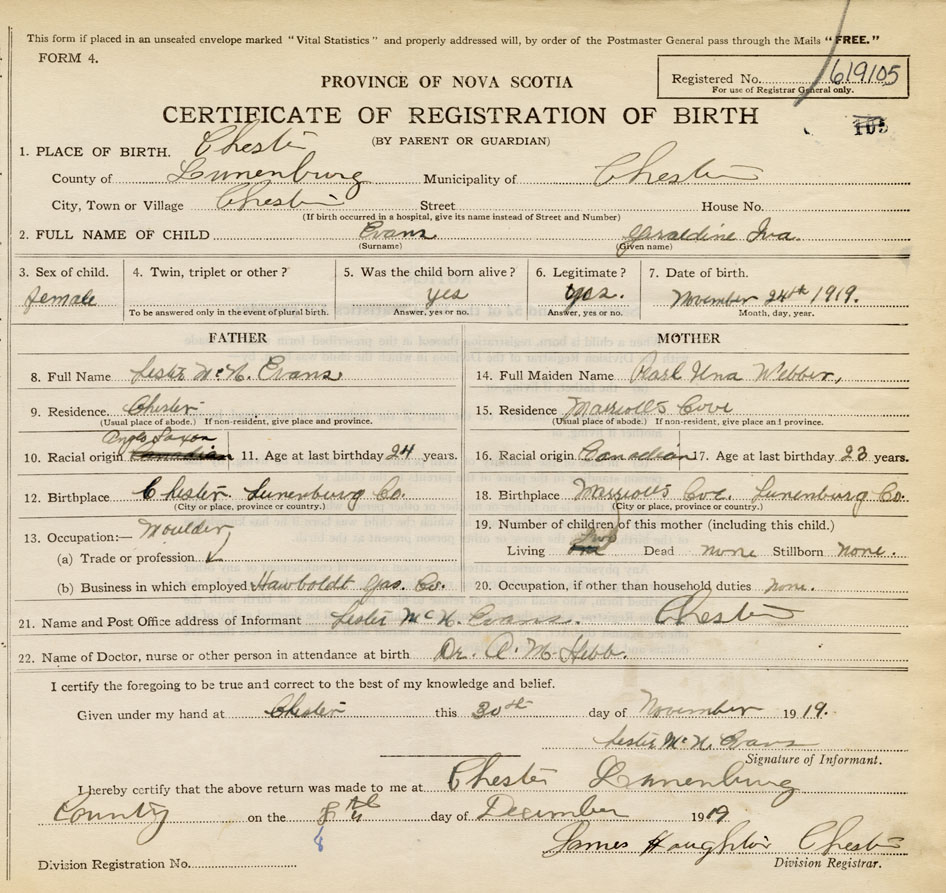 21. Name and Post Office address of Informant Lester McN. Evans Chester, Lunenburg Co., NS