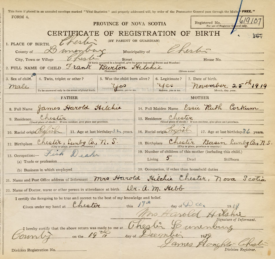 21. Name and Post Office address of Informant Mrs. Harold Hilchie Chester, Lunenburg Co., NS