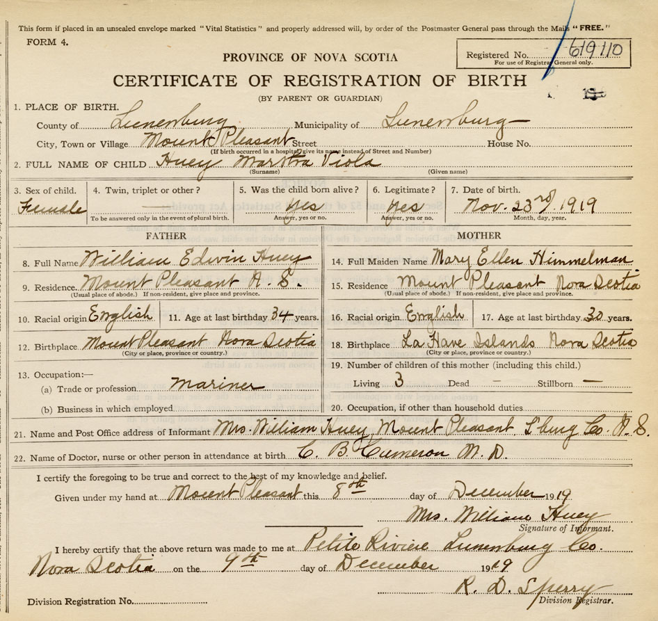 21. Name and Post Office address of Informant Mrs. William Huey Mount Pleasant, Lunenburg Co,. N.S.