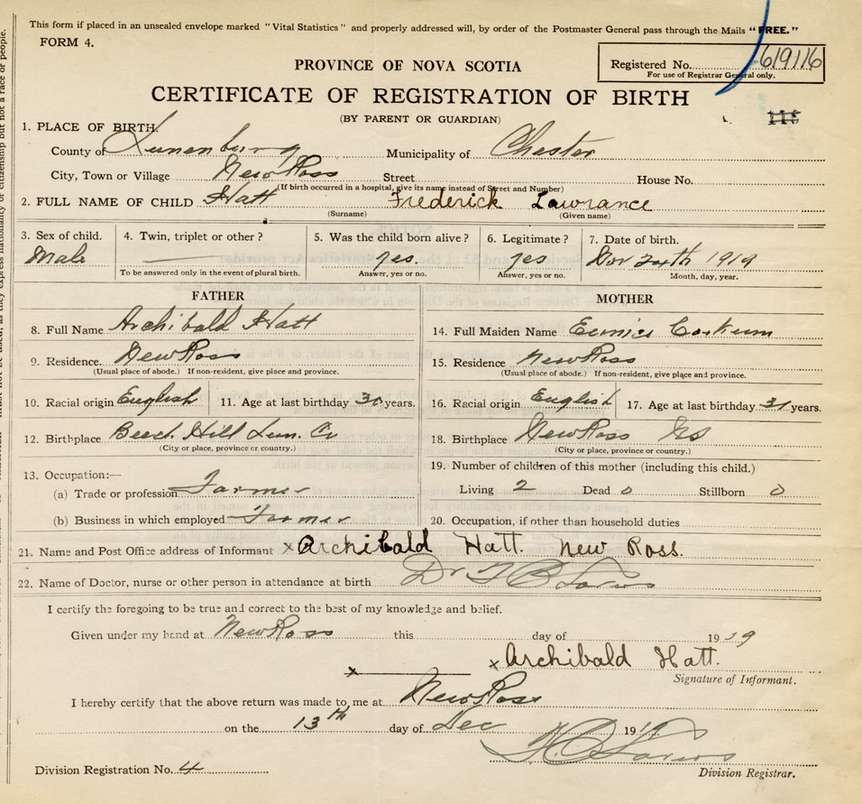 21. Name and Post Office address of Informant Archibald Hatt New Ross, Lunenburg Co., NS